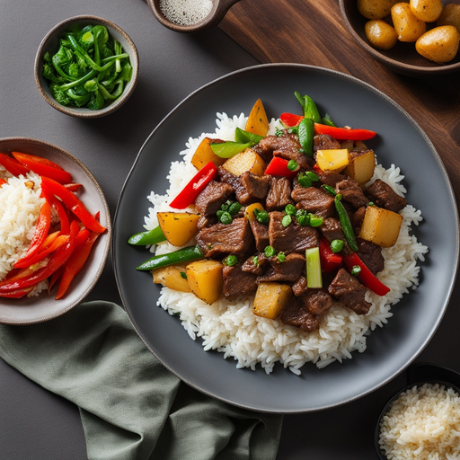 A delicious stir-fry dish with tender beef, potatoes, and colorful veggies