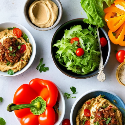 8. 8. Serve the stuffed bell peppers on a bed of shredded lettuce with a dollop of hummus on top.