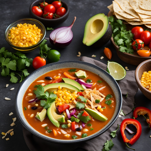 Tortilla strips, avocado slices, and cilantro for serving