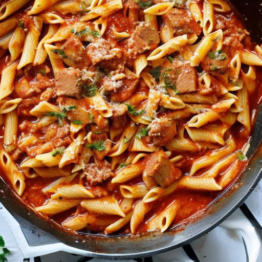 A delicious dish featuring chicken, beef, and pasta in a creamy tomato sauce.