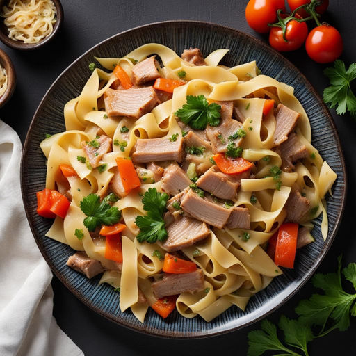 Indulge in a creamy and savory pasta dish with tender pork shoulder and a medley of colorful vegetables.