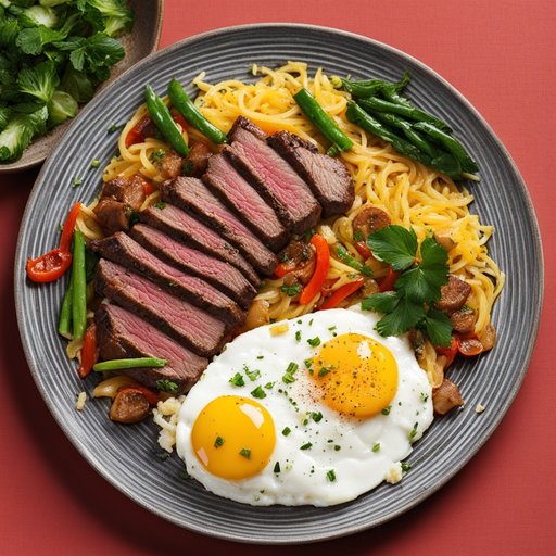 A delicious and hearty stir-fry with tender flank steak, eggs, and a mix of vegetables, served over a bed of jasmine rice.