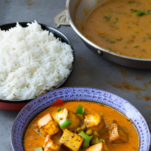 This recipe is a vegan and gluten-free curry dish made with firm tofu, basmati rice, and bell peppers in a creamy coconut sauce.