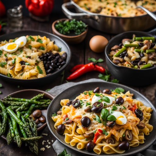 3. 3. In a large skillet, sauté mushrooms, olives, roasted red pepper, and asparagus until tender.