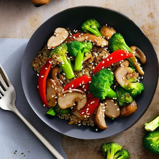 8. In the same pan, stir-fry the vegetables (bell pepper, scallions, mushrooms, broccoli) until crispy.