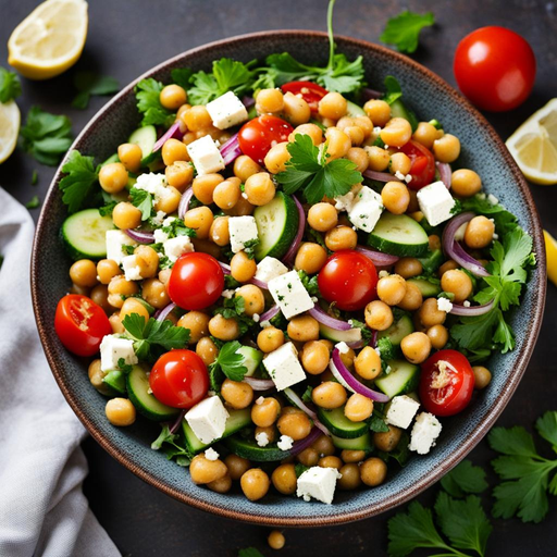1. 1. In a large bowl, combine chickpeas, cherry tomatoes, cucumber, red onion, and feta cheese.
