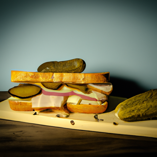 A delicious meat and pickle sandwich with melted Swiss cheese and sautéed onions.