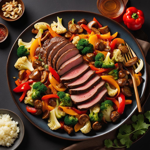 Juicy beef sirloin steak served with a flavorful stir-fry of button mushrooms, cabbage, cauliflower florets, and bell pepper.