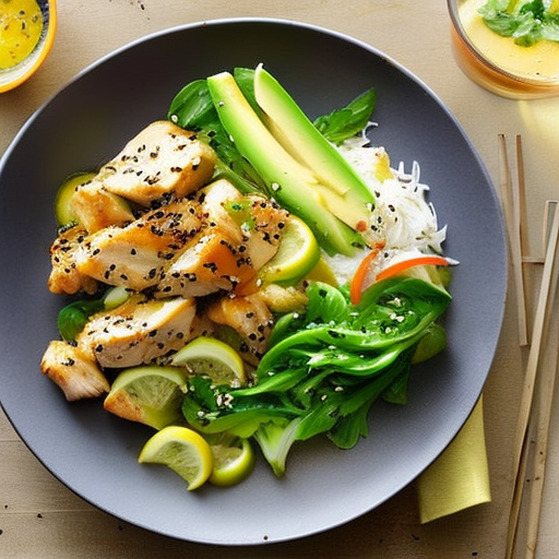 A delicious Asian dish with tender chicken, creamy avocado, and fresh vegetables.