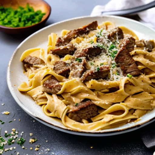 A rich and creamy pasta dish with tender beef strips in a savory alfredo sauce