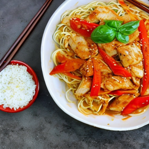 11. Serve the chicken noodle stir fry and garnish with chili sauce if desired.