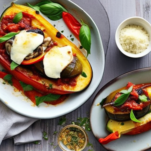 A delicious dish made with red bell pepper, eggplant, zucchini, and fresh mushrooms, stuffed with a creamy mixture of Parmesan and mozzarella.