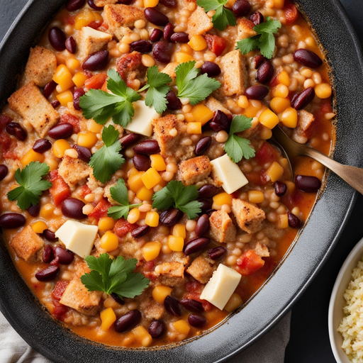 A hearty casserole filled with chicken, beans, rice, and cheese, perfect for a comforting meal.