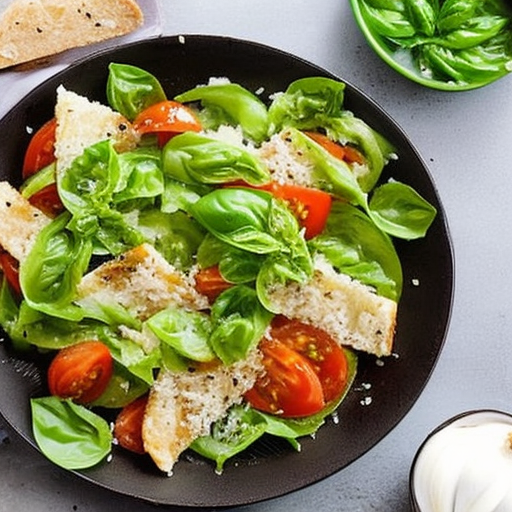 7. In a large bowl, combine the basil leaves, leaf lettuce, cherry tomatoes, onion slices, and toasted ciabatta.