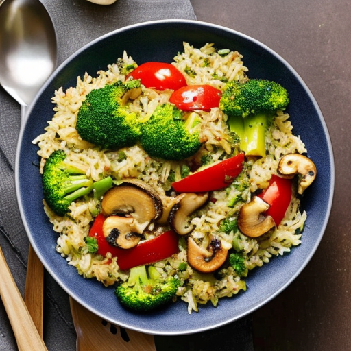 A flavorful and hearty rice pilaf with mushrooms, broccoli, and bell pepper.