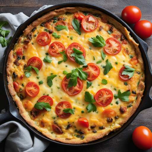 A delicious frittata filled with potatoes, tomatoes, and cheese, perfect for a hearty breakfast.