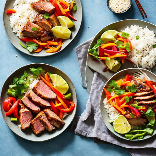 A delicious and savory rice bowl with tender teriyaki tuna steaks, colorful bell peppers, and zesty lime.