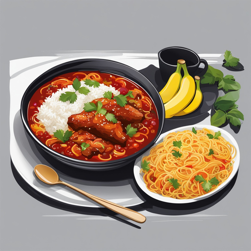 7. 7. To assemble the rice bowl, place a serving of cooked basmati rice in a bowl, top with the spicy chicken drumsticks, beef bouillon cube mixture, banana peppers, and a generous spoonful of spaghetti sauce.