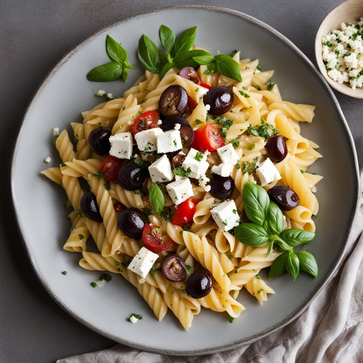 A delicious and flavorful pasta dish with Mediterranean-inspired ingredients like feta cheese, tomatoes, olives, and mushrooms.