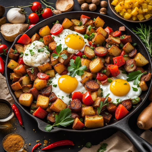 A delicious and hearty breakfast dish made with crispy pan-fried potatoes, vegetables, and eggs.