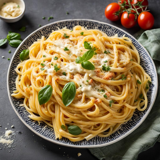 Indulge in this creamy and cheesy pasta dish made with mozzarella cheese, eggs, and low-fat milk.