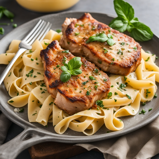 Tender and juicy pork chops served with creamy bow-tie pasta for a satisfying meal.