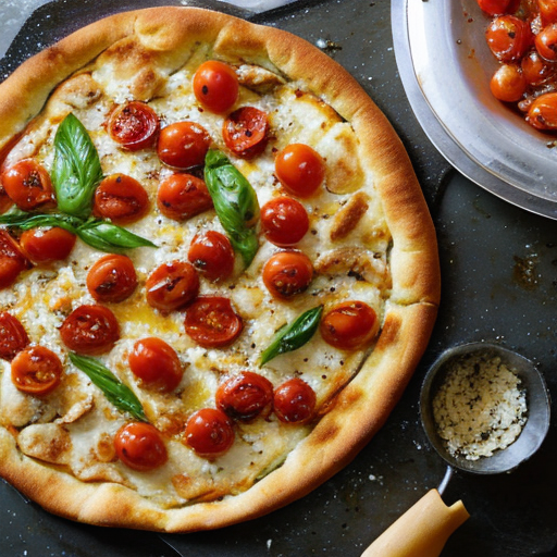 This delicious pizza features seasoned chicken and cherry tomatoes on a homemade pizza crust.