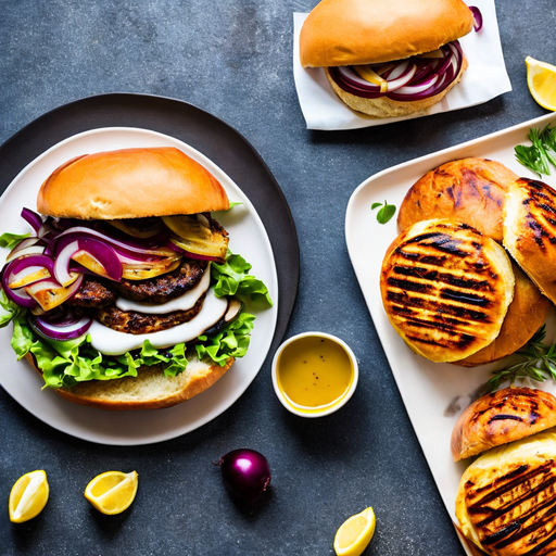 6. 6. Assemble the burger by placing the grilled patty on a bun, topping it with caramelized onions, and drizzling the lemon garlic sauce on top.