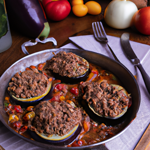 A flavorful and hearty main dish featuring eggplant, ground beef, and a medley of vegetables with a delicious tomato-based sauce.