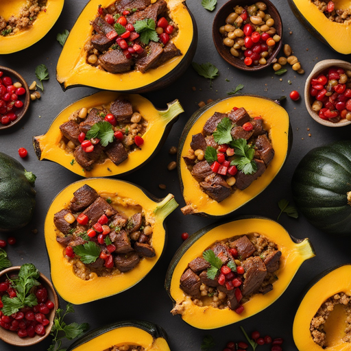 A delicious and hearty dish featuring tender beef tenderloin stuffed inside roasted acorn squash.