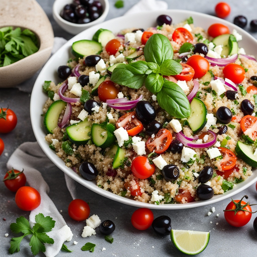 2. In a large bowl, mix the cooked quinoa with cherry tomatoes, cucumber, red onion, olives, feta cheese, and fresh parsley