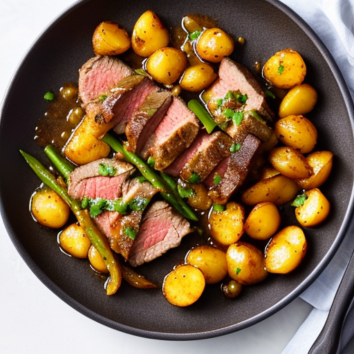 A delicious and hearty beef skillet with tender top round steak, new potatoes, and carrots.