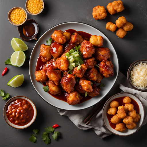 A delicious and flavorful dish featuring tender chicken drumsticks glazed with sweet chili sauce, served with crispy tater tots.