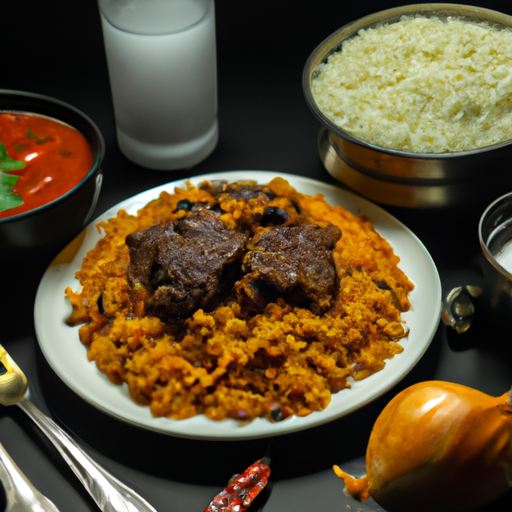 This delicious dish combines rice, beef, onions, tomatoes, and harissa to create a flavorful and hearty main course.