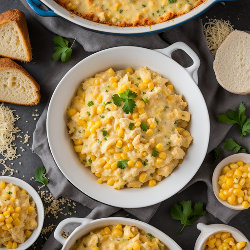 A comforting casserole with tender chicken, sweet corn, and creamy cheeses.