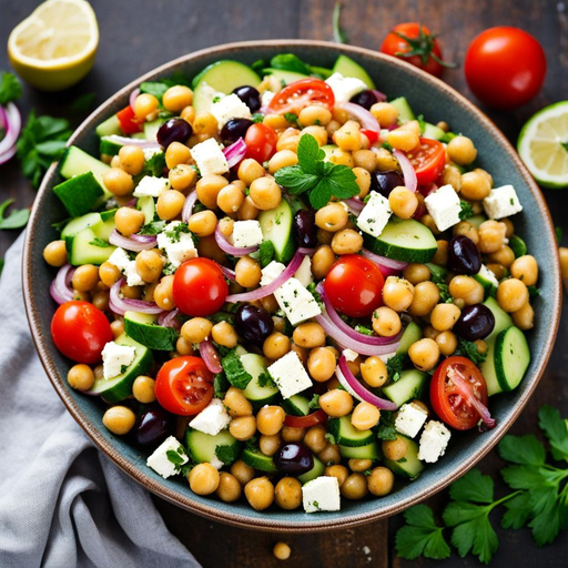 1. 1. In a large bowl, combine chickpeas, cherry tomatoes, cucumber, red onion, olives, and feta cheese.