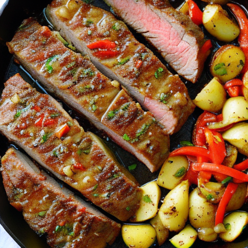 A delicious recipe for pan-seared beef sirloin steak with a mix of vegetables and potatoes.