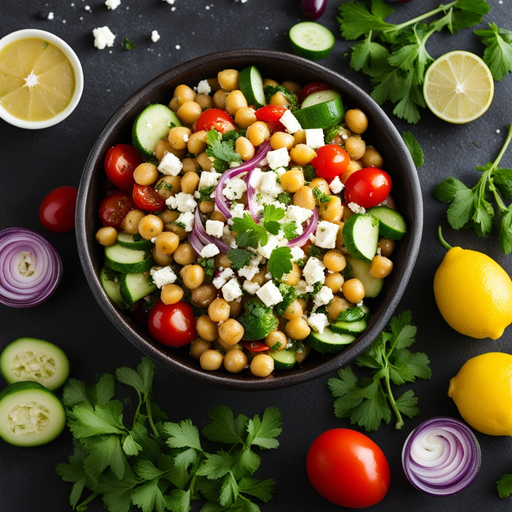 1. 1. In a large bowl, combine chickpeas, cherry tomatoes, cucumbers, red onion, and feta cheese.
