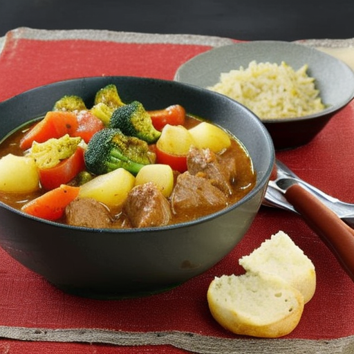A hearty stew with beef, boiling potatoes, cheese, fresh tomatoes, and broccoli.