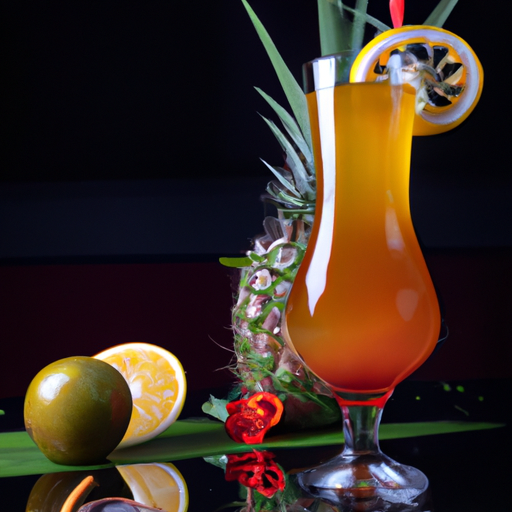 A delicious tropical cocktail made with dark and white rum, passion fruit, orange juice, lemon juice, sugar syrup, and grenadine.
