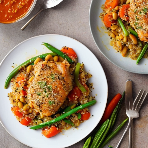 A hearty and nutritious one-pot meal featuring chicken thighs, vegetables, quinoa, and beans.