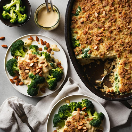 A comforting casserole with tender beef, broccoli, and a creamy almond milk sauce topped with crunchy almonds.