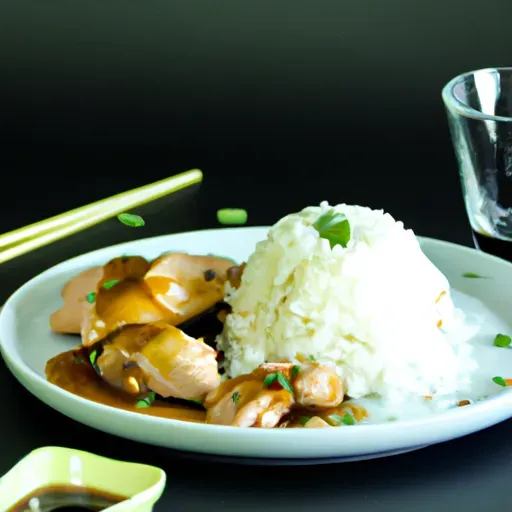 A delicious dish of rice and chicken with soy-sauce and herbs.