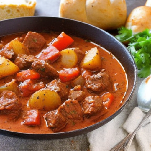A hearty and flavorful beef stew with tomatoes, onion, bell pepper, and new potatoes.