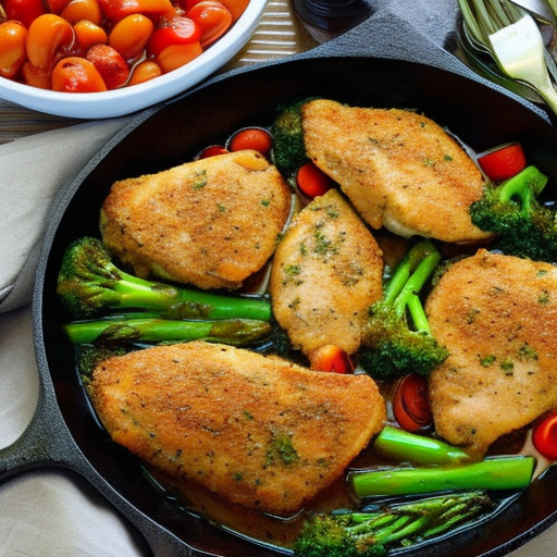 A delicious main dish featuring pan-fried chicken breast with a side of vegetables and potatoes.