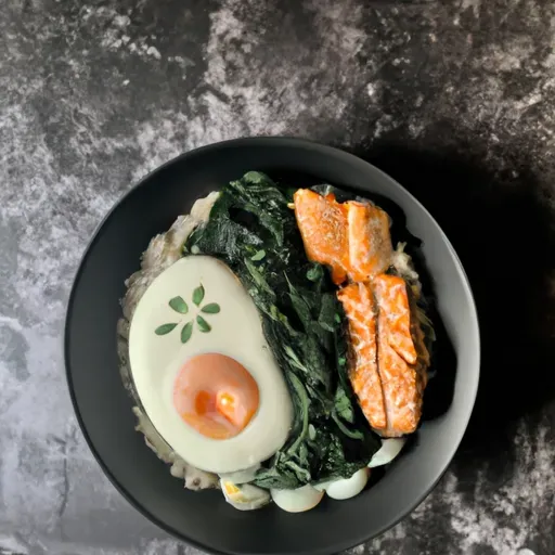A delicious and nutritious meal of salmon, spinach, eggs, and rice.