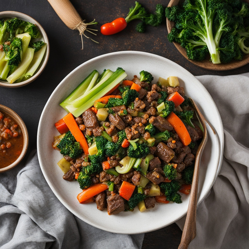 A delicious and nutritious stir fry recipe with ground beef and a variety of vegetables
