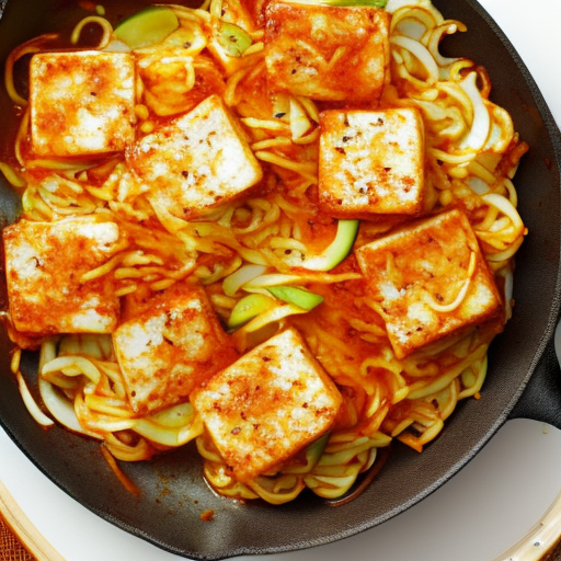 A delicious vegetarian dish featuring pan-fried tofu and egg noodles.