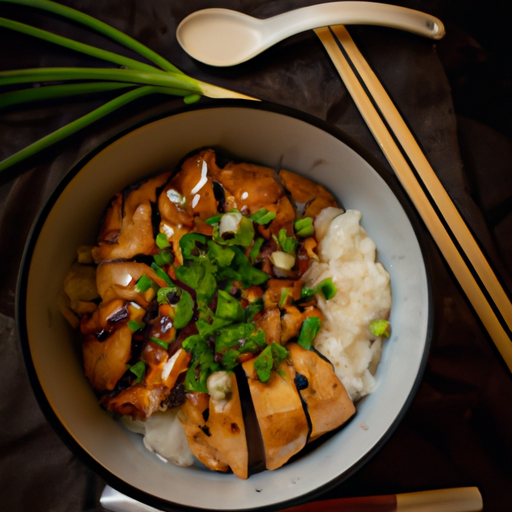 7. Once the rice is done cooking, fluff it with a fork and divide it onto plates. Spoon the chicken mixture over each plate of rice. Top with the chopped green parts of the spring onions before serving.