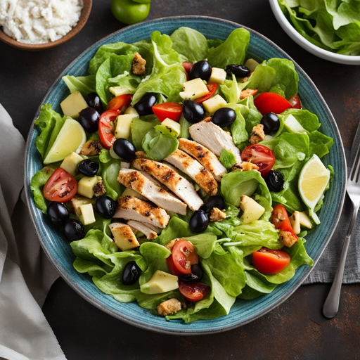A refreshing and hearty salad featuring bibb lettuce, black olives, baby corn, and tender chicken meat.
